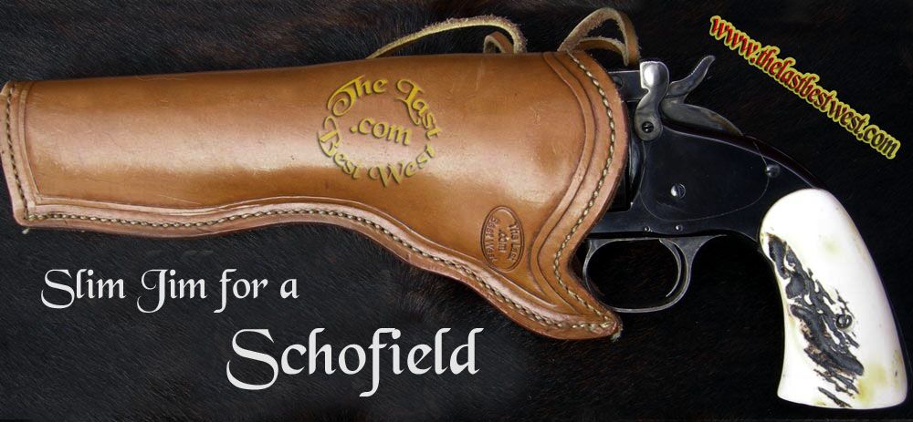 Our Slim Jim Holster can be worn for a strong hand draw, a cross-draw, or for the twist or “Hickok” draw. In particular the modern Schofield reproductions work very well in this sleek holster style. We also recommend the Slim Jim, along with our 4 inch belt for carrying those big 50 Calibre sidearms, as well as the massive black powder pistol, the Walker Colt.