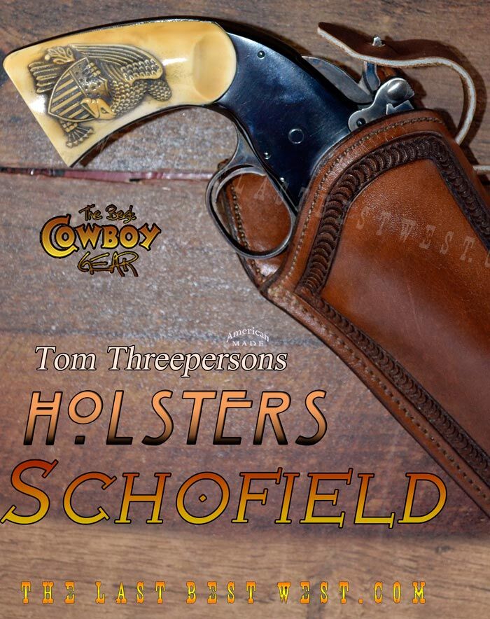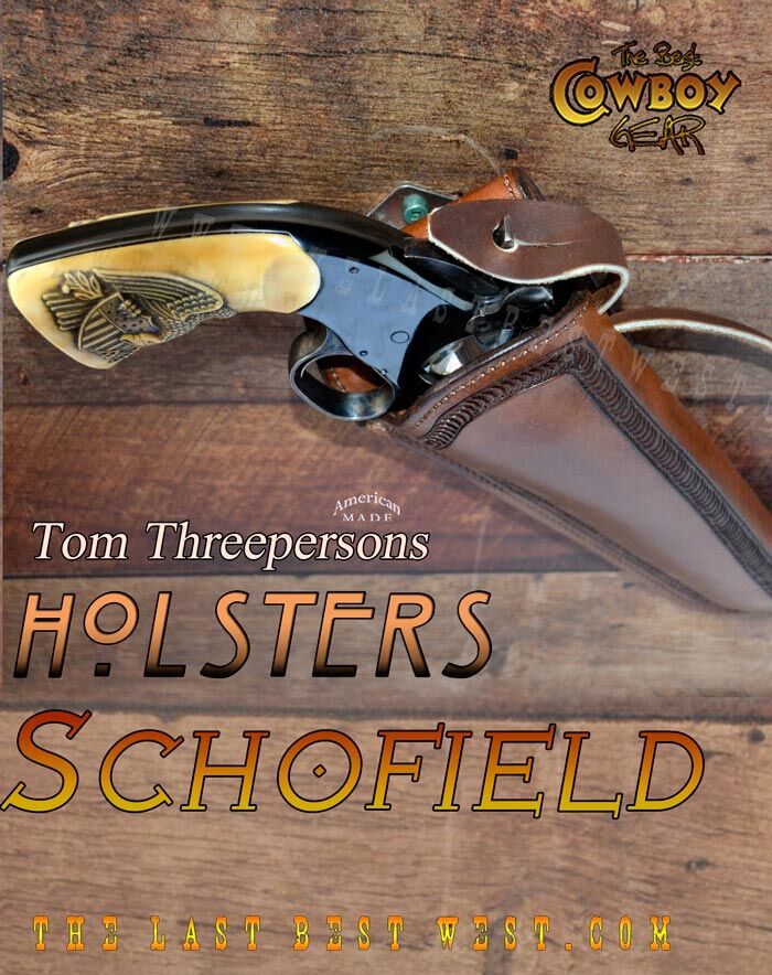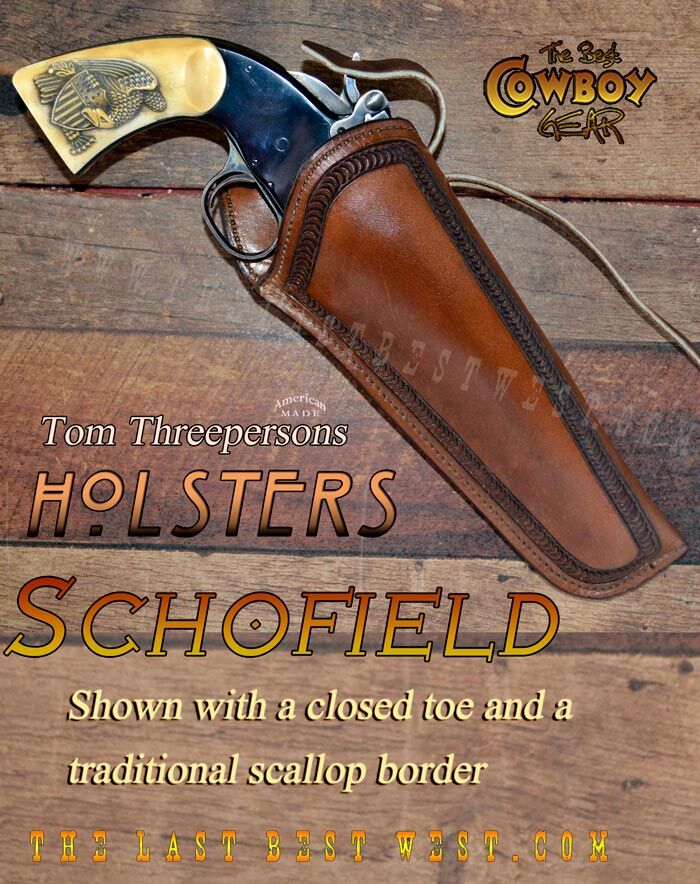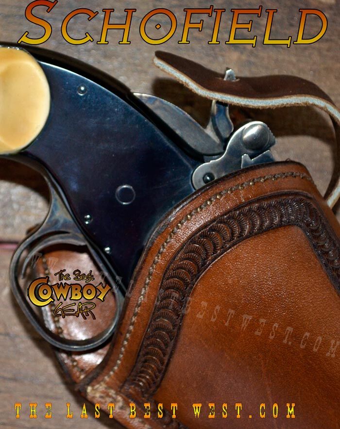 This closed toe holster can be used for any single action pistol, we are calling it the schofield because it just sounds good! Shown in our signature color deadwood brown, the scallop border has a darker highlight stain, to make it pop off the leather.